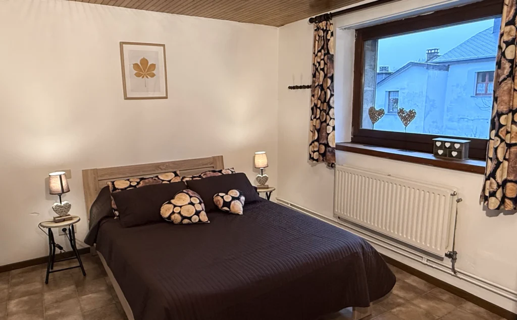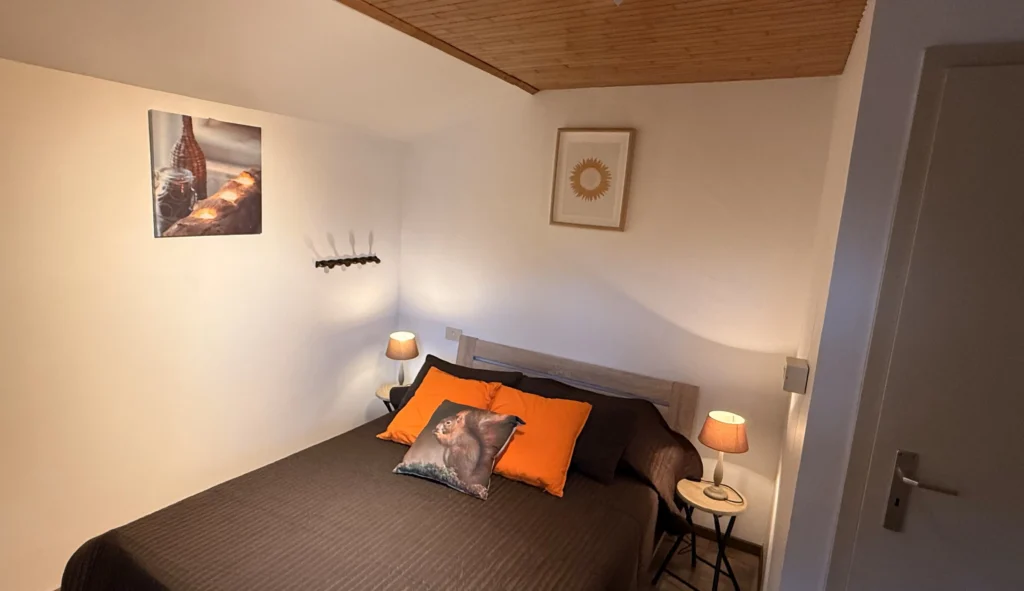 • Chambre double avec lit 140×200 cm, poutres apparentes et belle hauteur sous plafond.